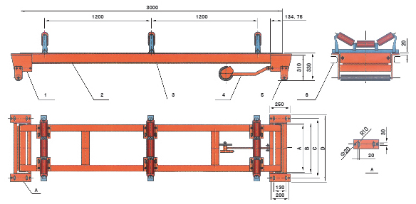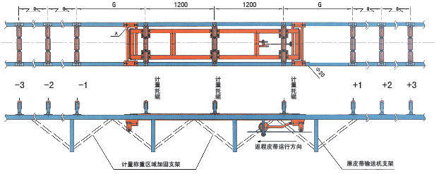 說明:1、稱重架 2、稱重橋 3、原輸送機(jī)托輥改制的計量托輥 4、測速車及測速傳感器 5、輔助輥 6、輸送機(jī)框架
